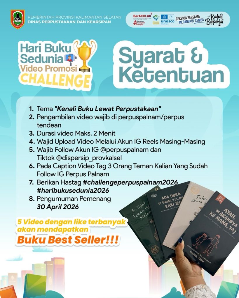 Selain itu, peserta juga diwajibkan mengikuti akun resmi @perpuspalnam dan TikTok @dispersip_provkalsel, serta menandai tiga teman dalam caption dan menyertakan tagar #challengeperpuspalnam2026 dan #haribukusedunia2026.